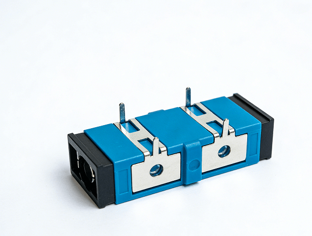 带金属焊脚 SC 型双工光纤法兰盘(适配器 / 耦合器) 一、核心定义 带金属焊脚的 SC 型双工光纤法兰盘,是专为 PCB 电路板集成设计的光纤无源器件,核心功能是实现两根 SC 型光纤跳线的精准、低损耗对接,金属焊脚用于直接焊接在电路板上,替代传统螺丝 / 卡扣固定,实现设备内部光纤接口的一体化集成。 SC 型:方形卡扣式光纤接口,是光纤通信领域最通用的标准接口之一; 双工:可同时对接 2 根光纤(收发各 1 根),满足双向光信号传输需求; 带金属焊脚:专属 PCB 焊接结构,支持 SMT 贴片 / 手工焊接,适配设备内部集成场景。 二、核心应用场景 1. 通信终端设备内部集成(最核心场景) 家庭 / 企业光猫(ONT/ONU):光纤入户终端的核心接口,直接焊接在主板上,作为入户 SC 光纤跳线的接入端,是家庭宽带的核心连接部件; 光纤收发器、工业交换机、光模块:企业 / 工业级网络设备内部,通过焊脚固定法兰盘,实现设备光纤接口的一体化设计,提升结构稳定性; PON 设备、光端机、OLT:运营商广电的光纤传输设备,用于设备内部光纤链路与外部跳线的对接,保障长距离光信号传输。 2. 定制化 / 工业设备集成 工控光纤设备、工业物联网网关:工业场景下的光纤通信设备,焊脚结构抗震性强,可适应工业现场的振动、高低温环境; 定制化光纤测试仪器:光时域反射仪(OTDR)、光功率计等测试设备的内部接口,用于光纤链路的检测与校准; 医疗 / 安防光纤设备:内窥镜、安防监控光端机等需要光纤接口的专用设备,实现小型化、高集成度的接口设计。 3. 高密度 PCB 板卡集成 …